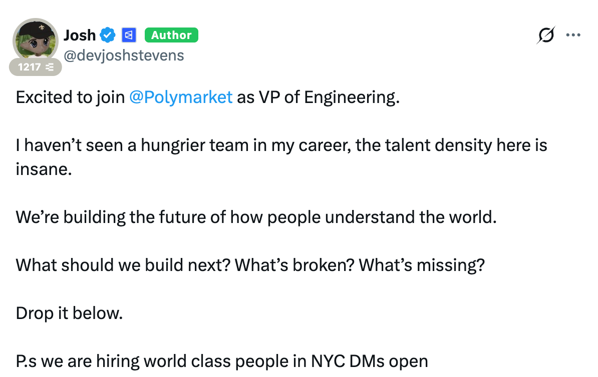 On March 24th, former Aave engineer and senior vice president Josh announced that he had joined Polymarket. And just half a month later, he was already posting again on his personal account to recruit engineers. It seems that the developer gap at the rapidly developing Polymarket is much larger than outsiders might imagine.