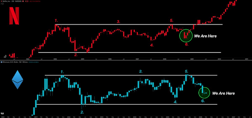 The current price action, which is the sixth interaction, places Ethereum near the lower boundary of the range, which is just the same stage Netflix was before its eventual breakout.
