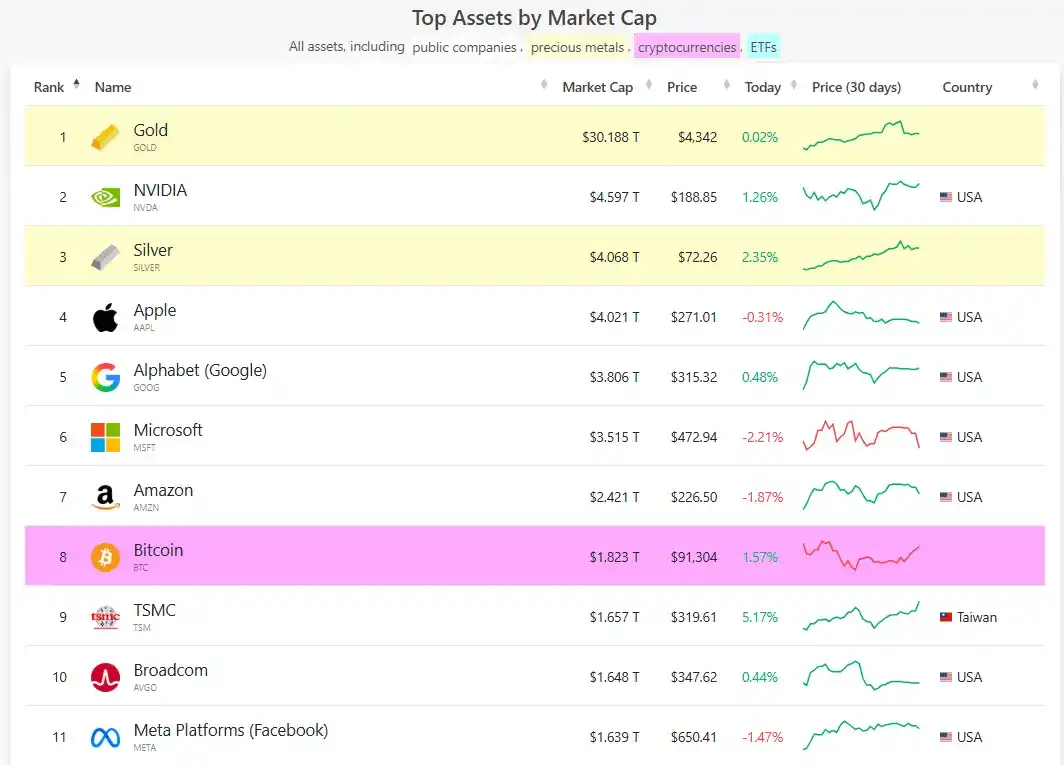 According to CompaniesMarketCap data, the ranking of the global top 10 assets in2025 showed profound structural adjustments. Gold led the pack with a theoretical market cap of approximately $30 trillion, while silver's market cap approached $4 trillion, securing a spot in the top three. Tech stocks occupied the middle of the rankings, while Bitcoin's market cap was around $1.8 trillion, slipping to eighth place.