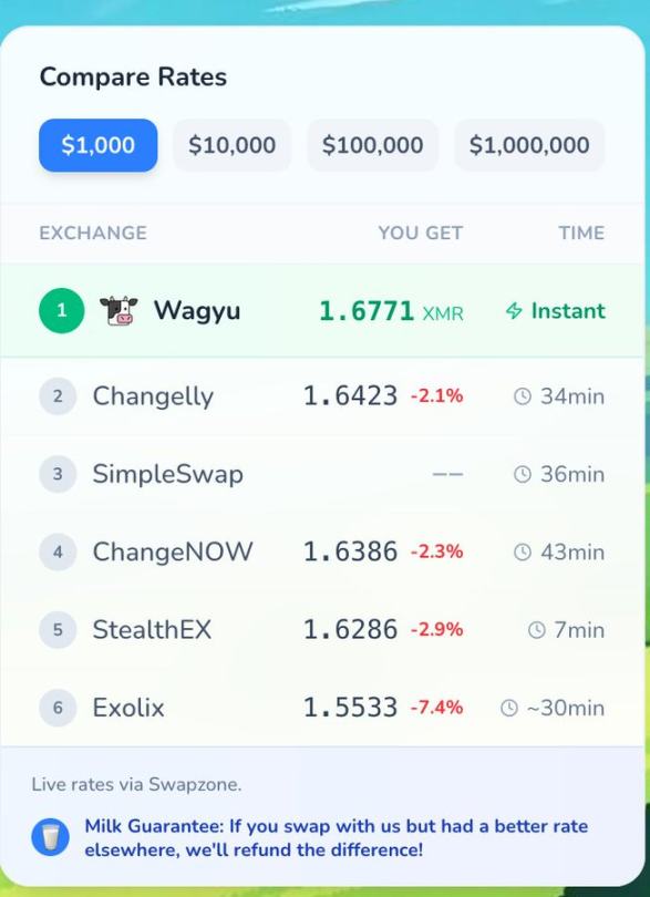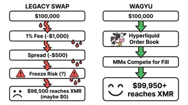 When users can get exchange-level pricing with zero freeze risk through Wagyu, who will pay 1% fees to anonymous offshore services that might freeze their funds?