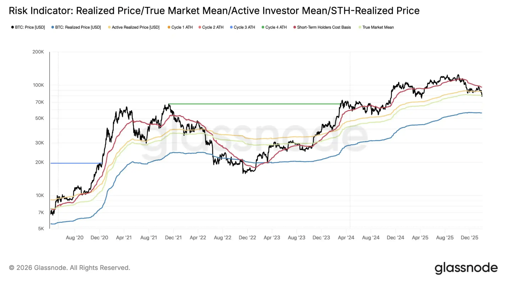 Bitcoin fell below $78,000. Glassnode updated the key on-chain price distribution of Bitcoin as follows: STH (Short-Term Holder) cost basis, reflecting the average holding price of new buyers/traders who entered the market in recent months, is $95,400.