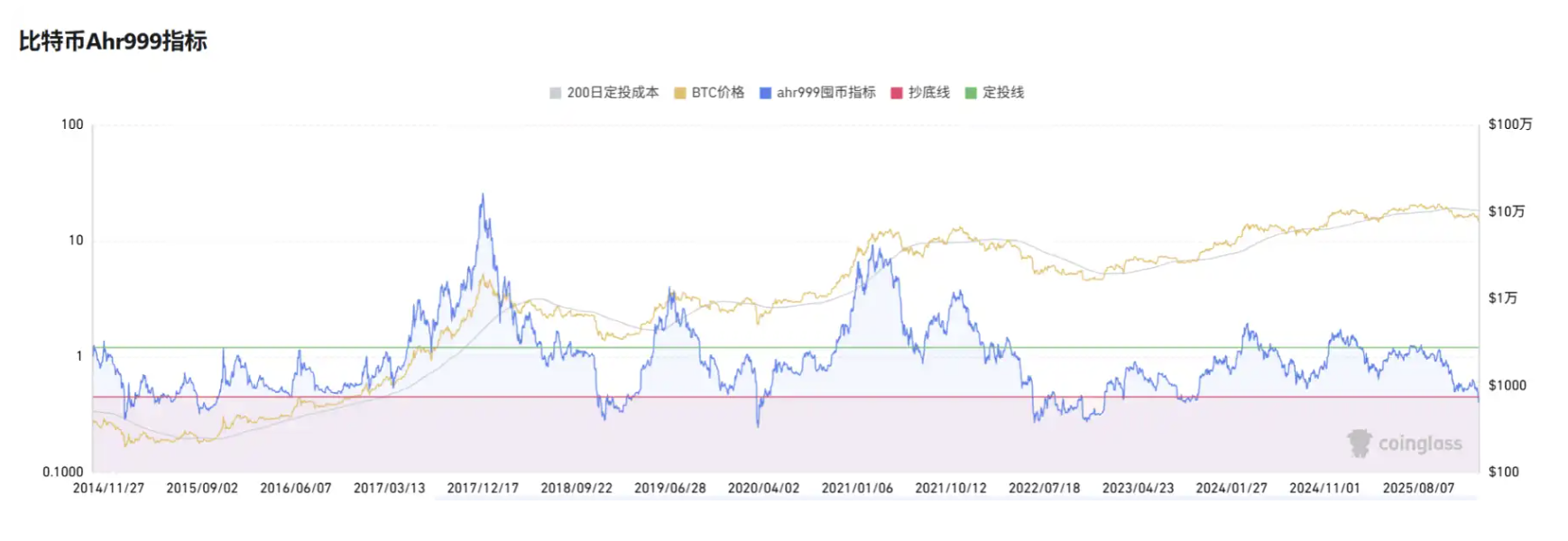 The ahr999 indicator was invented years ago by Weibo user ahr999 to evaluate BTC's short-term returns and price deviations. The calculation formula for this indicator is (current price / 200-day dollar-cost average cost) × (current price / exponential growth valuation), where the exponential growth valuation is based on a fitting curve of historical prices and block heights, representing the long-term "fair value". Historical experience shows: ahr999 < 0.45 is the low-price buying zone; 0.45-1.2 is suitable for dollar-cost averaging; >1.2 is the high-price zone.