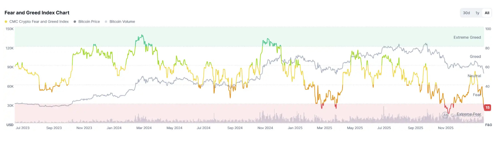 The market fear index is 15, and market sentiment has once again fallen into extreme fear.