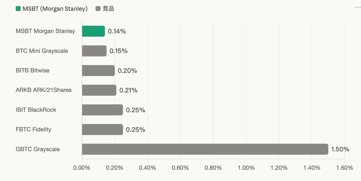 MSBT's annual management fee is set at 0.14%, which is 1 basis point lower than Grayscale's Bitcoin Mini Trust (0.15%) and 11 basis points lower than BlackRock's IBIT (0.25%), making it the product with the lowest fee among all U.S. Bitcoin spot ETFs.