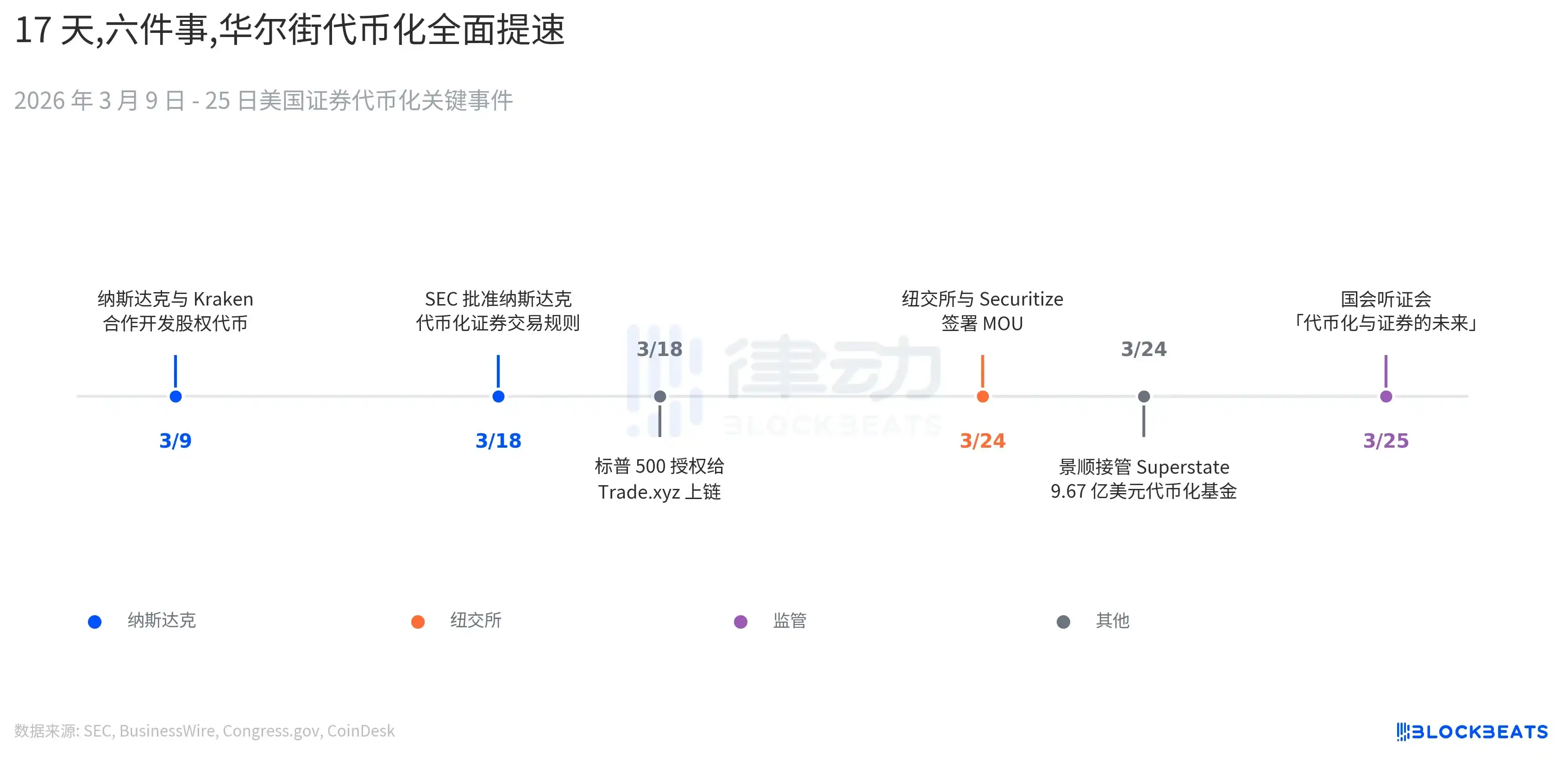 On March 24, the NYSE signed with Securitize; on the same day, Invesco, which manages $2.2 trillion in assets, announced it would take over the USTB fund from on-chain treasury management company Superstate, with a size of $967 million. On March 25, the U.S. House Financial Services Committee held a special hearing, "Tokenization and the Future of Securities: Modernizing Our Capital Markets." According to FinTech Weekly, attendees included Kenneth Bentsen Jr., CEO of the Securities Industry and Financial Markets Association (SIFMA), and Summer Mersinger, CEO of the Blockchain Association.