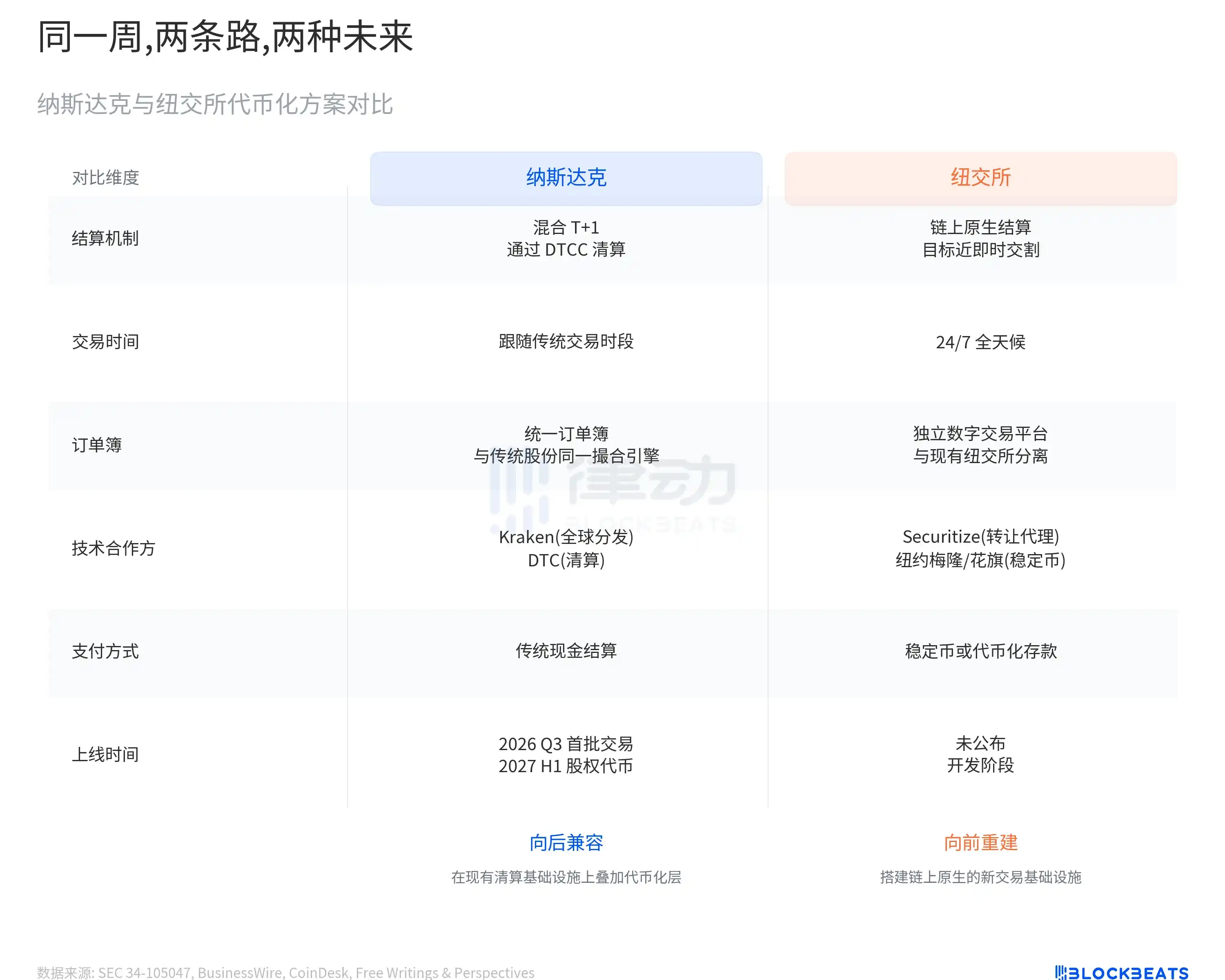Six events in 17 days. Two major exchanges, three traditional asset management firms, one SEC approval, one congressional hearing. Among these events, the plans of Nasdaq and the NYSE are the most worthy of closer examination. The two are following different technical paths, and the divergence is greater than most realize.