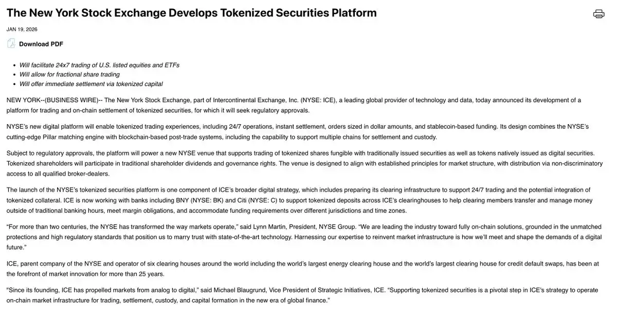 "Flash Crash Monday" is not over yet. Just now, the crypto market was hit by another bombshell—according to multiple media sources, the NYSE plans to launch a tokenized securities trading and on-chain platform supporting 24/7 trading. After investing $2 billion in Polymarket last year, the ICE Group is once again joining the wave of cryptocurrency transformation, this time using its stock exchange as the vehicle. It is worth mentioning that as early as last September, its "rival" Nasdaq had already submitted an application to the SEC for tokenized stock trading. This move by the NYSE is also interpreted by the outside world as a response to competition among stock exchanges.