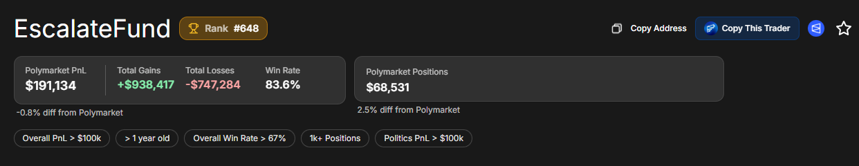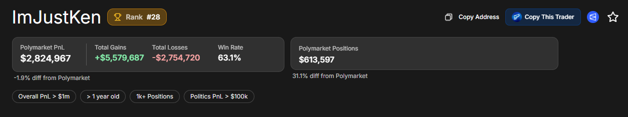 Top "NO" Holder for Timothée Chalamet: Address: 0x9d84ce0306f8551e02efef1680475fc0f1dc1344. This address has a high win rate of 63%, with a historical profit/loss of $2.82 million.