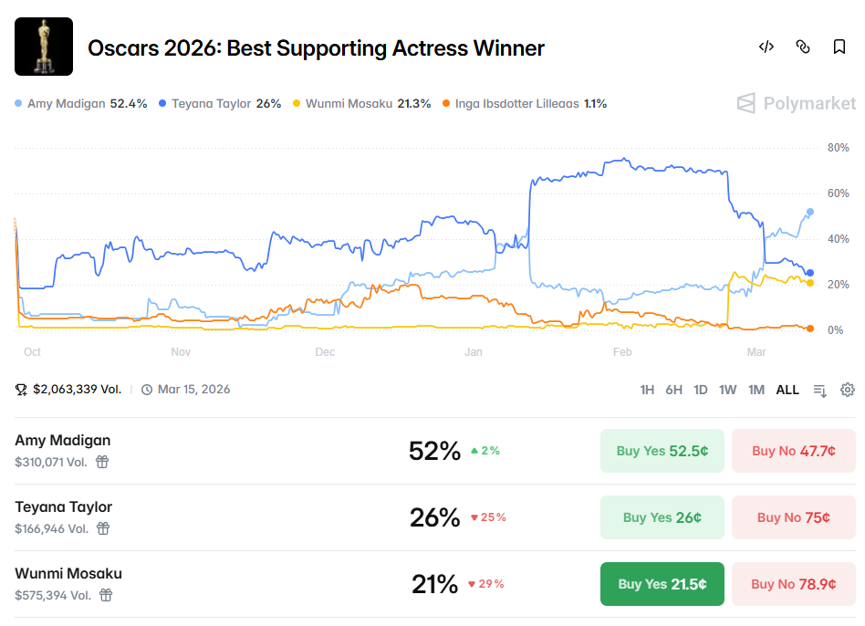 一、Best Supporting Actress Award (Link: https://polymarket.com/event/oscars-2026-best-supporting-actress-winner), Amy Madigan temporarily ranks first with a 52% real-time probability; Teyana Taylor ranks second with a probability of 26%; Wunmi Mosaku ranks third with a probability of 21%.