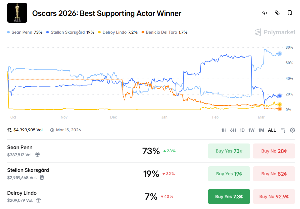 二、Best Supporting Actor Award (Link: https://polymarket.com/event/oscars-2026-best-supporting-actor-winner), Sean Penn temporarily ranks first with a 73% real-time probability; Stellan Skarsgård ranks second with a probability of 19%; Delroy Lindo ranks third with a probability of 7%.