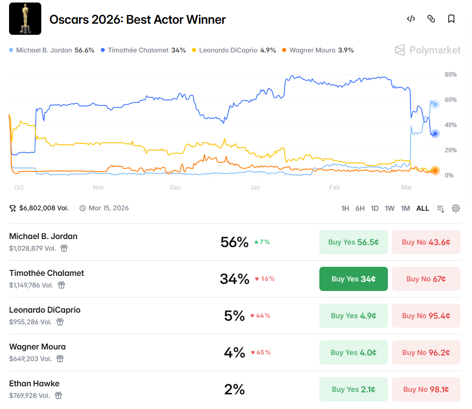 Polymarket Corresponding Event: Oscars 2026: Best Actor Winner, trading volume nearly $7 million;
