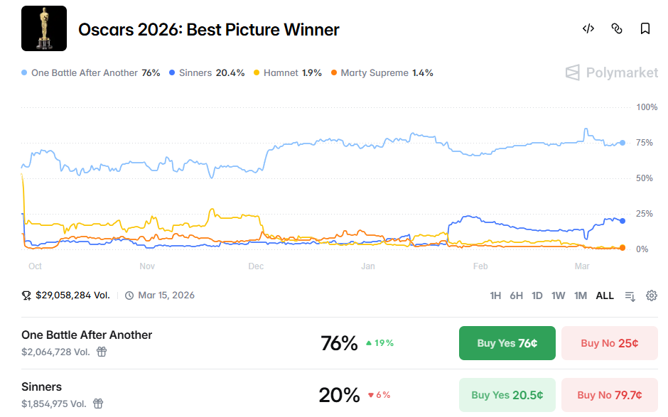 Polymarket Corresponding Event: Oscars 2026: Best Picture Winner, trading volume over $29 million;