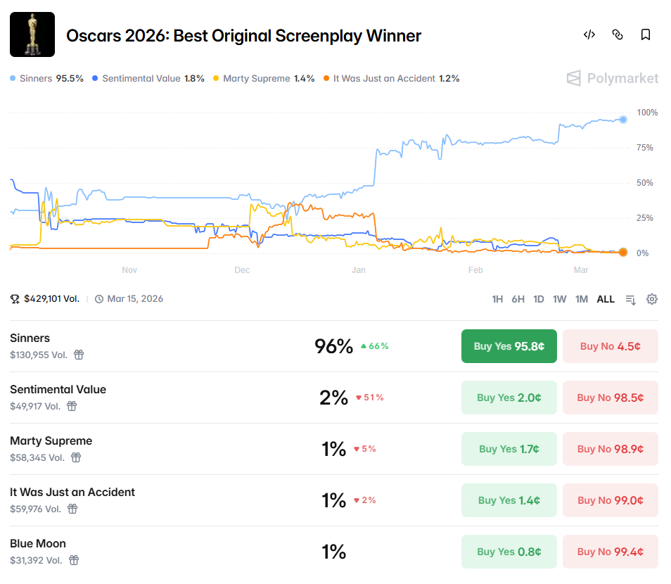 四、Best Original Screenplay Award (Link: https://polymarket.com/event/oscars-2026-best-original-screenplay-winner), "Sinners" temporarily ranks first with a 96% real-time probability, potentially a "sure bet" or "savings account" scenario.