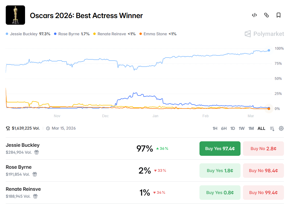 Polymarket Corresponding Event: Oscars 2026: Best Actress Winner, trading volume over $1.5 million;
