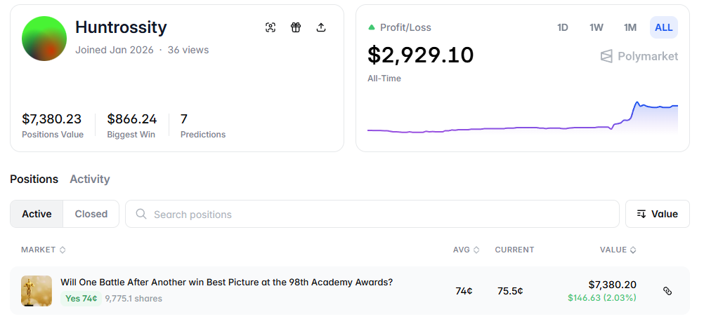 Address Holding Only the Single Event "One Battle After Another": Address: 0x8f49c70ce8e353c0531d39f5448f0ba5f561bf8d. This address bought nearly 10,000 "YES" shares at an average price of 74 cents 5 days ago. It currently holds only the single event bet for "One Battle After Another" winning Best Picture.