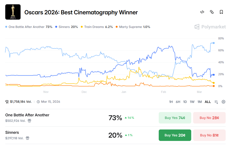 三、Best Cinematography Award (Link: https://polymarket.com/event/oscars-2026-best-cinematography-winner), "One Battle After Another" temporarily ranks first with a 73% real-time probability; "Sinners" ranks second with a probability of 20%.