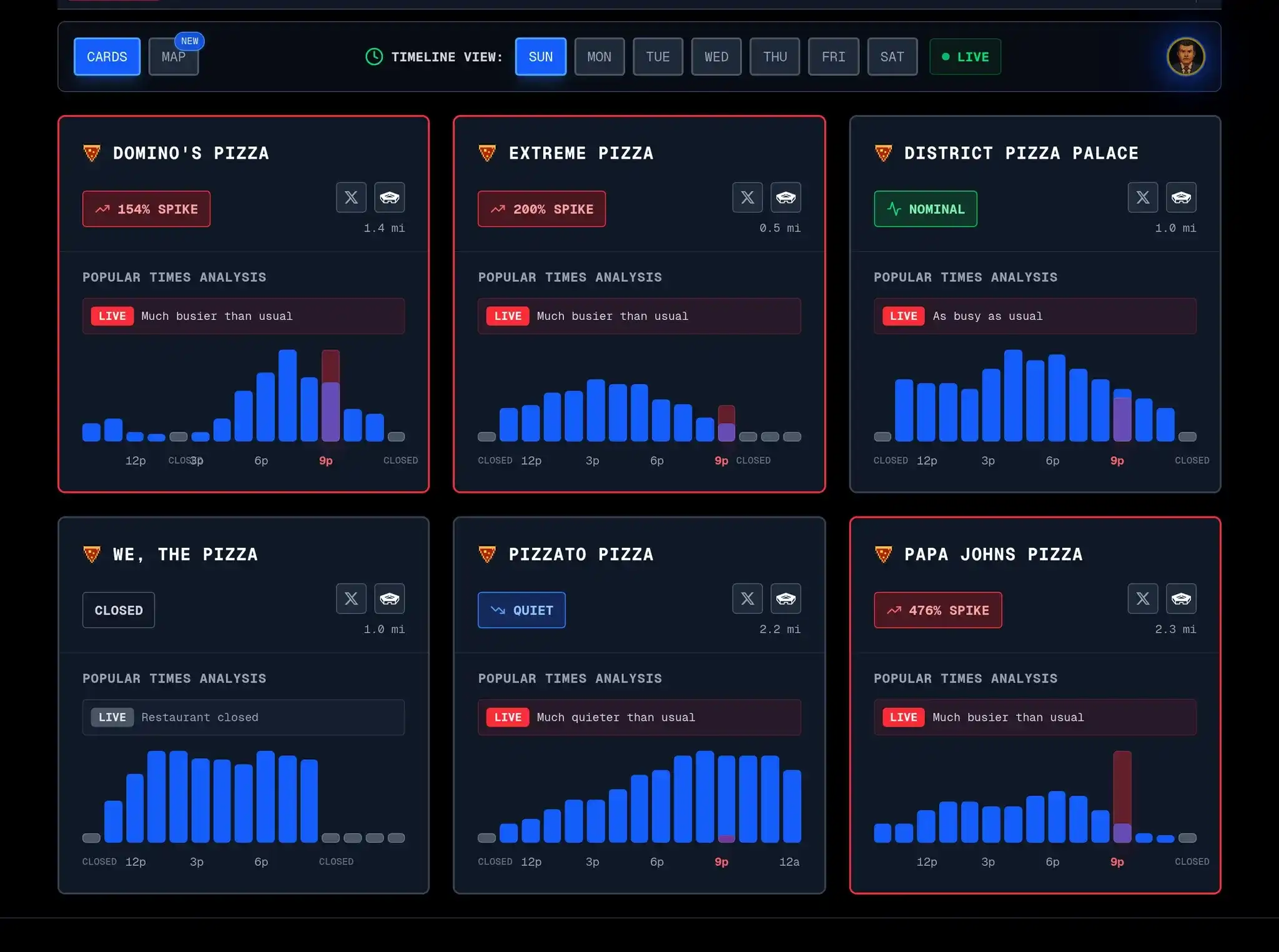 The latest data from Sunday evening shows that activity at the Papa John's pizza shop 2.3 miles from the Pentagon surged by 476%, while the closer Extreme Pizza saw a 200% increase. The peak increase of 1250% compared to the low set a new historical record.