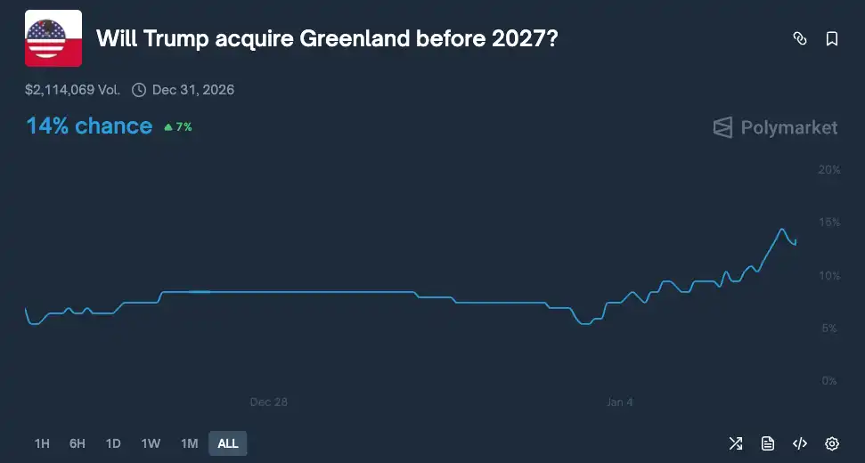 On Polymarket, the market for "Trump 'acquiring' Greenland by 2027" is highly sensitive. The probability in this market rose from about 7% on December 28 to the current 14%, a gain of 7 percentage points, with trading volume exceeding $2.1 million. This increase coincided with the timing of the Venezuela operation.