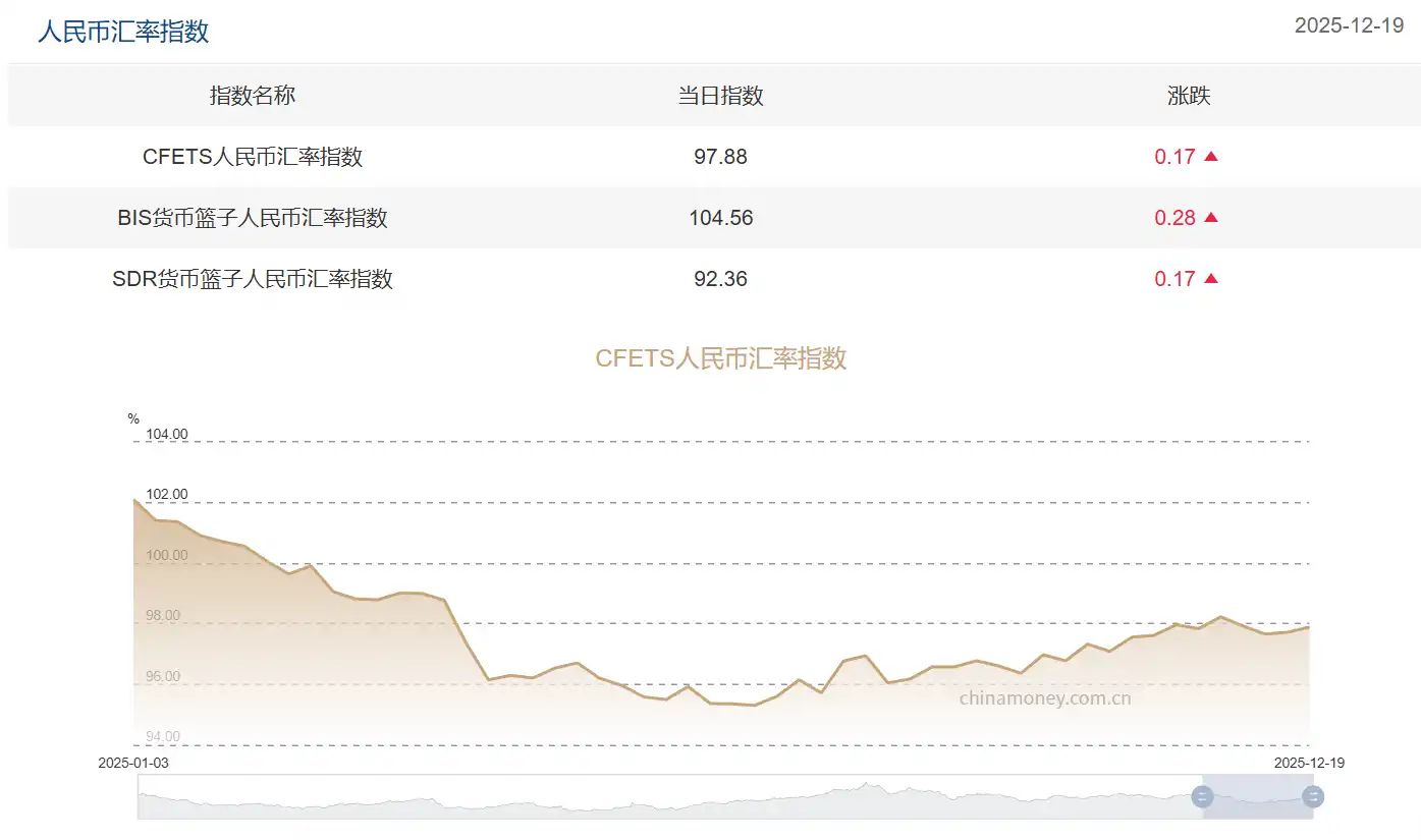 According to data from the China Foreign Exchange Trade System, from the beginning of this year to now, the Renminbi exchange rate against the CFETS Renminbi Exchange Rate Index, the BIS currency basket Renminbi Exchange Rate Index, and the SDR currency basket Renminbi Exchange Rate Index have all declined, with two major indices falling below 100.