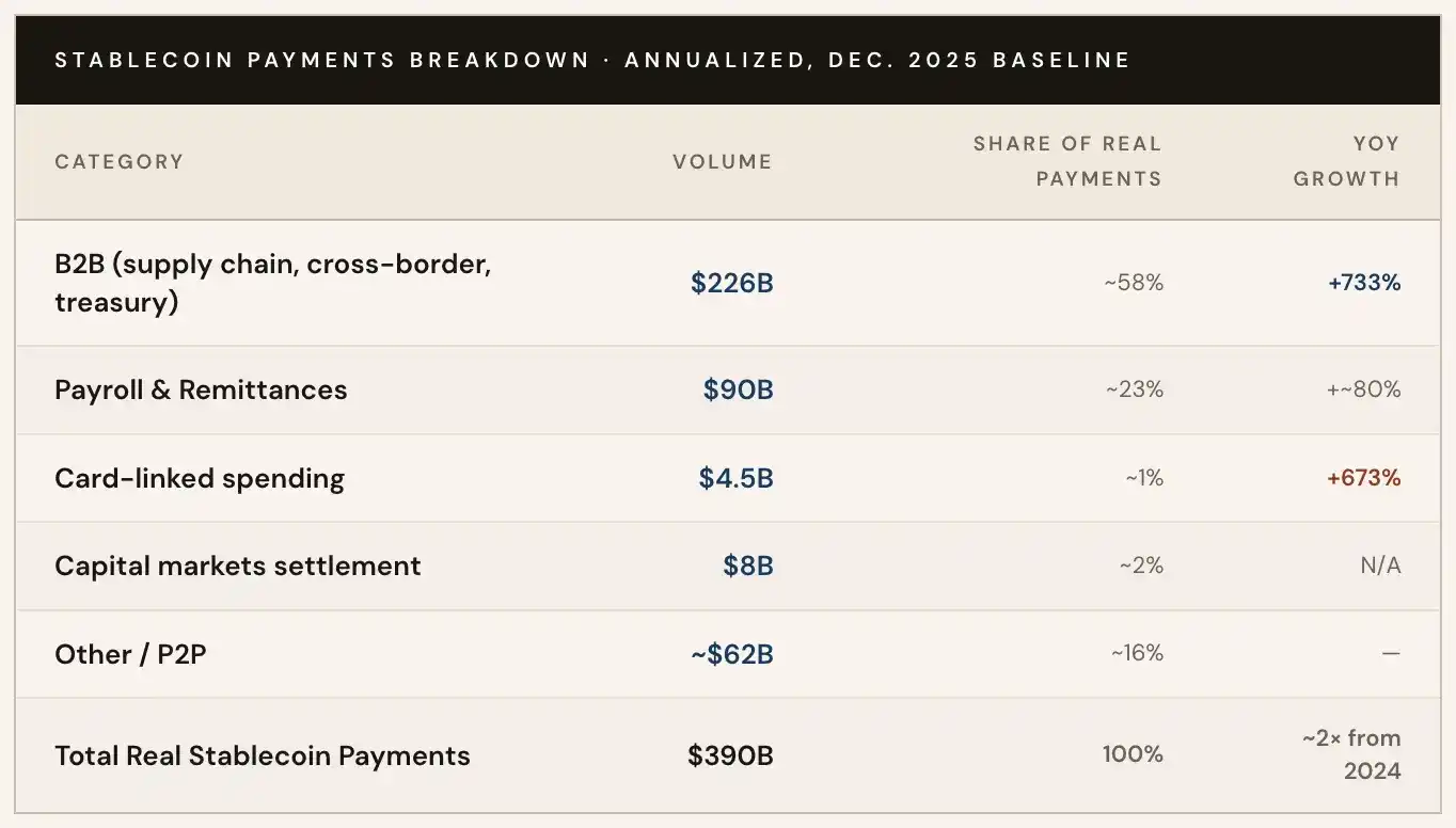 For reference: this total of $390 billion represents only 0.02% of McKinsey's estimated global annual payment volume of over $2 quadrillion. Specifically, B2B stablecoin flow accounts for about 0.01% of the global $160 trillion B2B payment market.