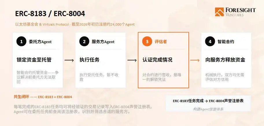 ERC-8183 was launched in March 2026 by the Ethereum Foundation's dAI team in collaboration with Virtuals Protocol. Each Job consists of three parties: Client (delegator), Provider (service provider), and Evaluator (assessor). Funds are escrowed by a smart contract until task acceptance is completed. The transacting parties do not need to trust each other, only the contract itself. ERC-8004 is a配套 identity protocol where each Agent registers on-chain and accumulates a reputation score based on historical transactions. Currently, about 24,000 Agents are registered network-wide.