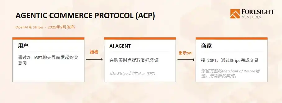 ACP was jointly released by OpenAI and Stripe in September 2025. Its core mechanism is delegated payment: users grant payment authority to the Agent upon confirming a purchase. The Agent completes the transaction using payment credentials compliant with the Delegated Payment Spec, and the merchant retains the Merchant of Record status. Currently, Stripe's SPT is the first and only implemented solution in this system.