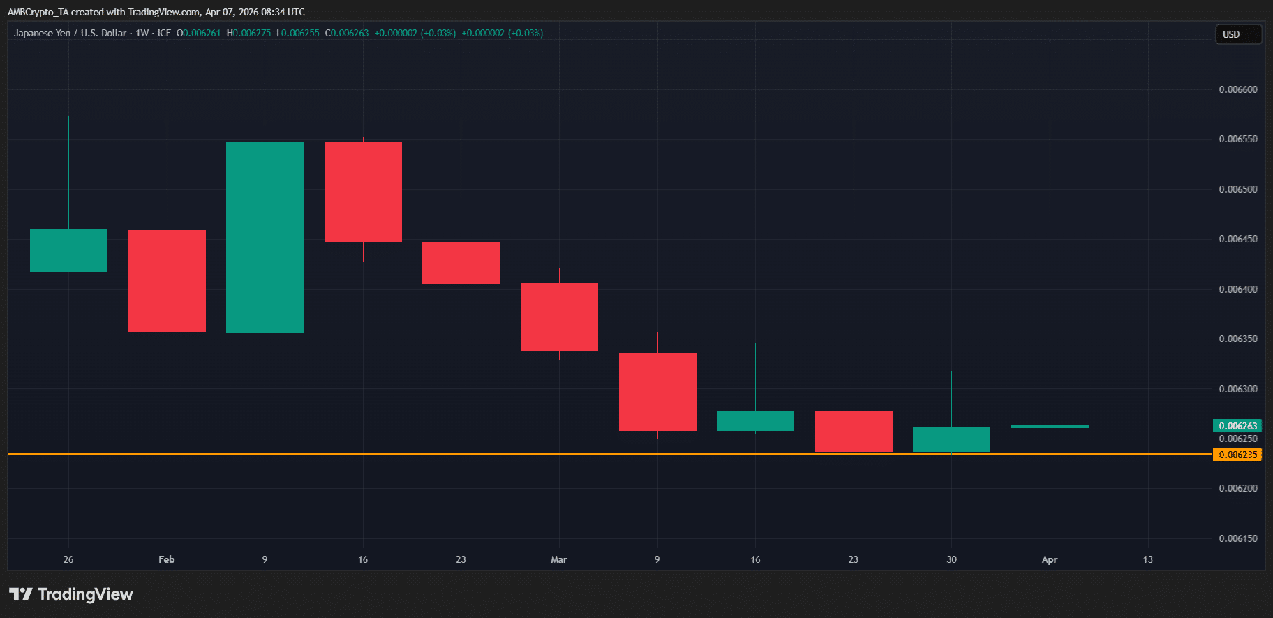 Notably, the currency market is already reacting. Throughout most of March, the JPY/USD pair moved into consolidation, and a similar structure is now forming in April, potentially signaling a local bottom.