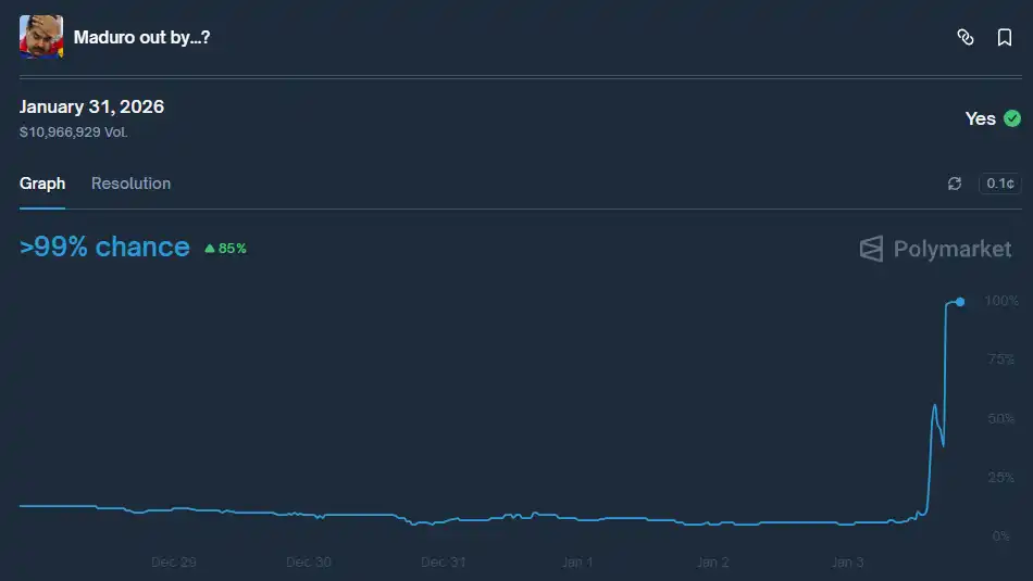 Hours before the operation began, three new wallets with no prior history on Polymarket suddenly started heavily betting "Yes" on the highly improbable market "Maduro loses power before January 31, 2026".