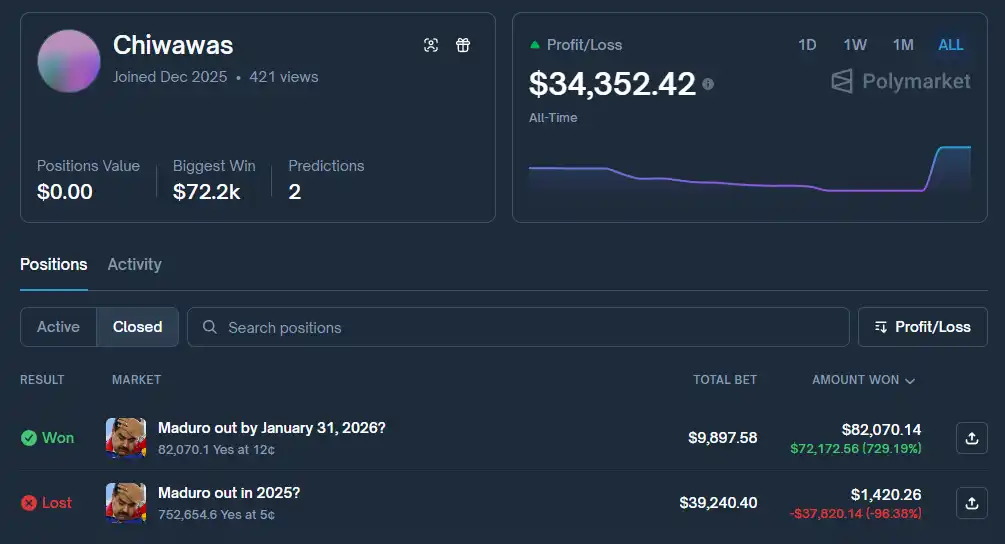 But in fact, Chiwawas had already heavily bet nearly $40,000 on the market "Maduro loses power within 2025" on the evening of December 26th.