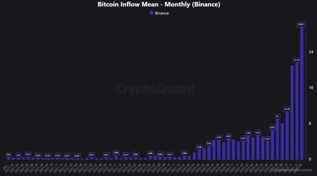 Maartunn determined the shift in exchange activity after examining the Bitcoin Inflow Mean metric on the monthly time frame. The key metric shows the average BTC per inflow transaction, which is signaling that larger holders are now more active on the Binance crypto exchange. As seen in the chart, the Monthly Inflow Mean to Binance increased to 21.7 BTC in December 2025.