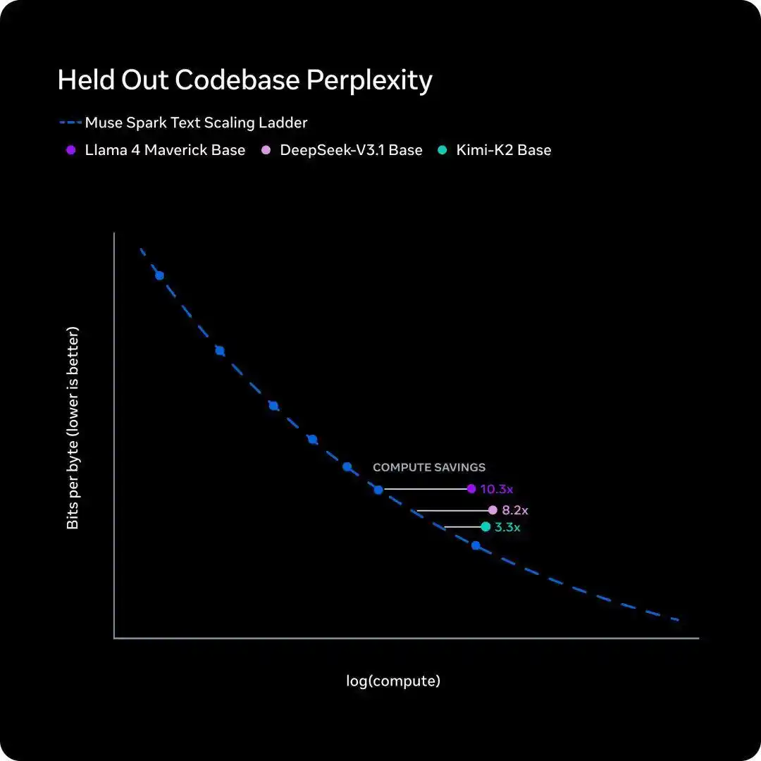 • Meta's scaling ladder measures "how much training compute is needed for the same intelligence level". The conclusion is that Muse Spark saves an order of magnitude compared to Llama 4 Maverick from a year ago.