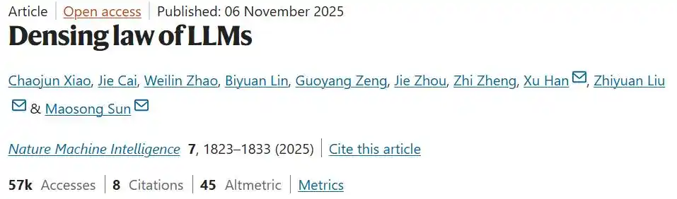 AThe 'Density Law' is a theory proposed by a joint team from Tsinghua University and ModelBest (面壁智能). Its core finding is that the intelligence density of AI models increases exponentially over time, with the number of parameters required to achieve a specific level of intelligence halving approximately every 3.5 months.