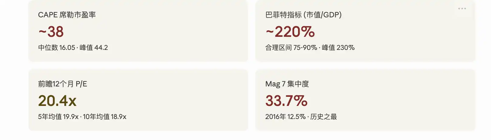 CAPE (Shiller P/E) is approaching 40, the highest level since the internet bubble; the "Buffett Indicator" (Market Cap/GDP ratio) broke through 230%, refreshing the historical record; the top ten constituents account for over 35% of the index weight, with market concentration in an unprecedented range in modern financial history. A post on the Reddit community r/stocks characterized the current market as the "most overextended state in history," sparking over 2,100 upvotes and 640 comments. The discussion focused on a core question: