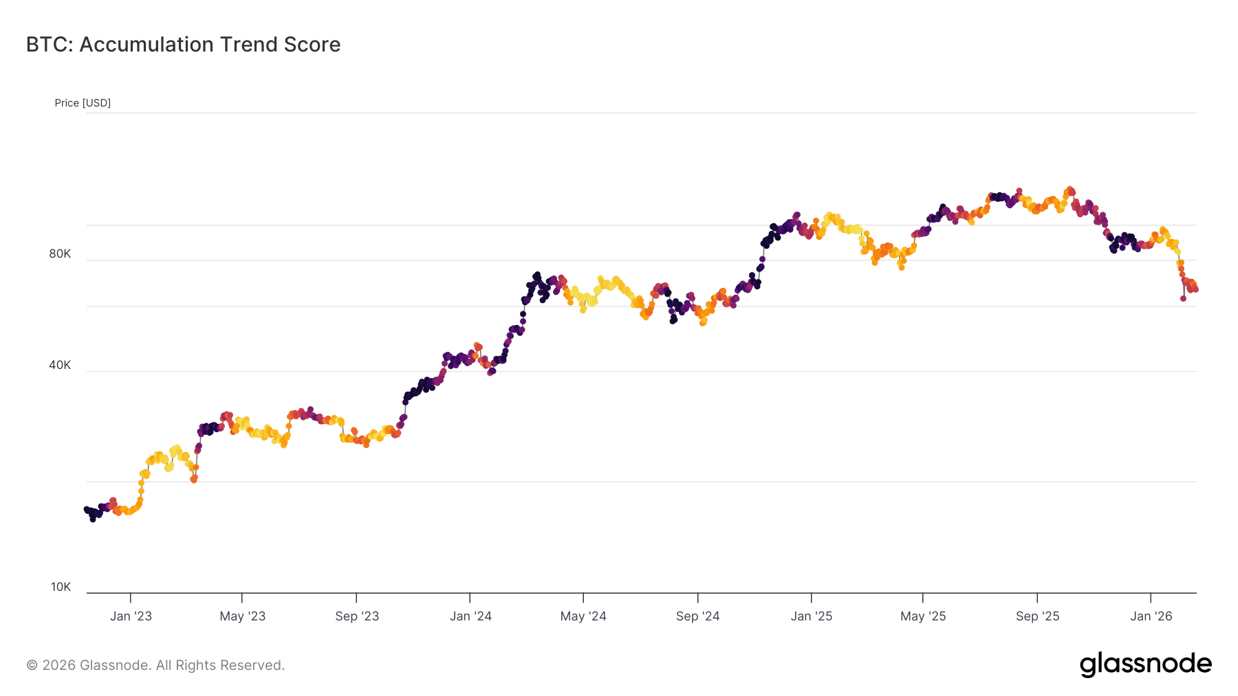 The Accumulation Trend Score offers a useful gauge of this behavior, measuring relative balance changes across wallet cohorts while assigning greater weight to larger entities. Since February 5th, Accumulation Trend Score has remained capped below 0.5, signaling a lack of aggressive accumulation, particularly among large holders.