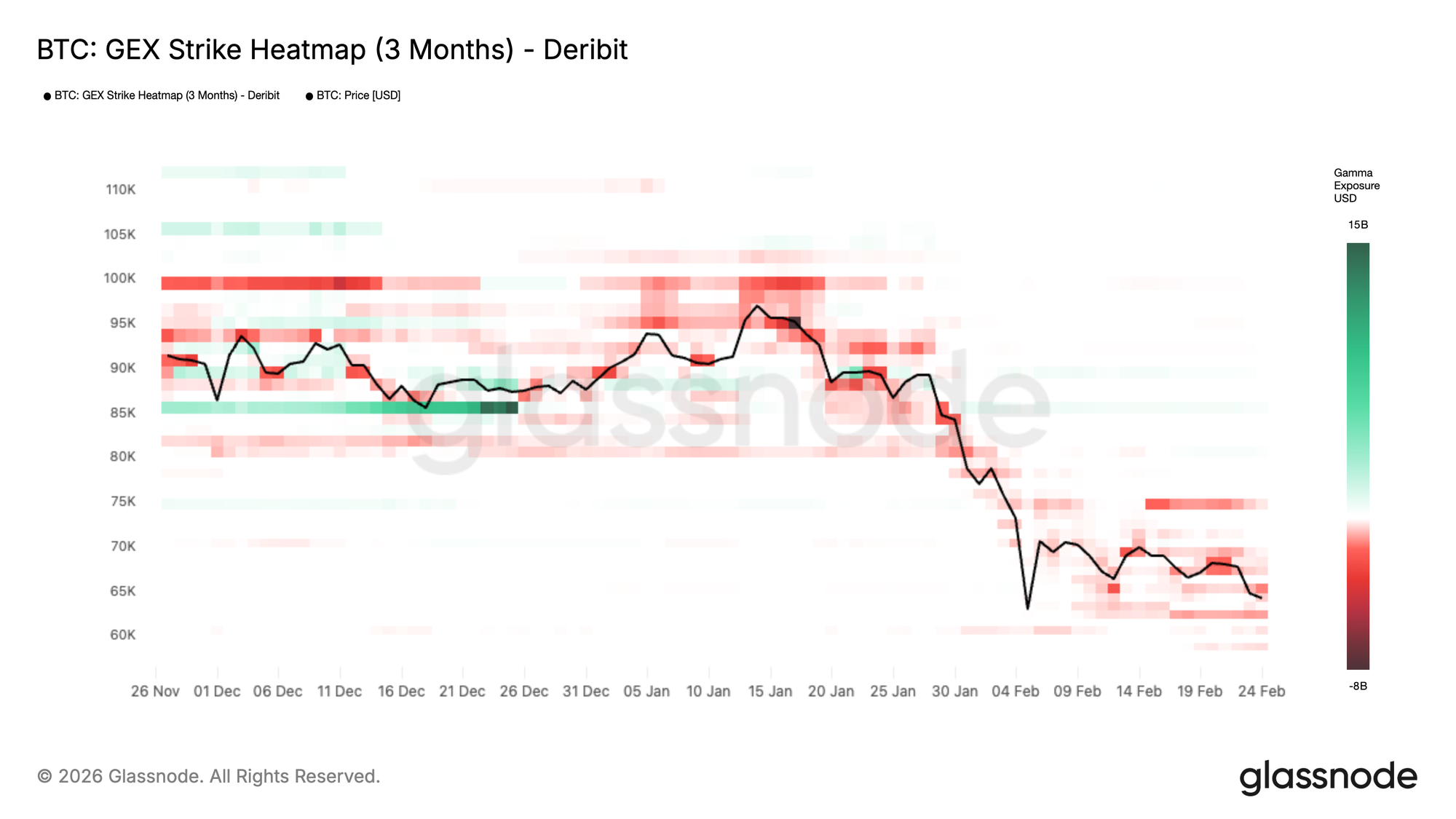 More recently, the heatmap shifted toward deeper red bands during the January to February decline. Expanding negative gamma around and below spot signaled a regime where dealer hedging reinforced the move, allowing volatility to expand and momentum to accelerate.