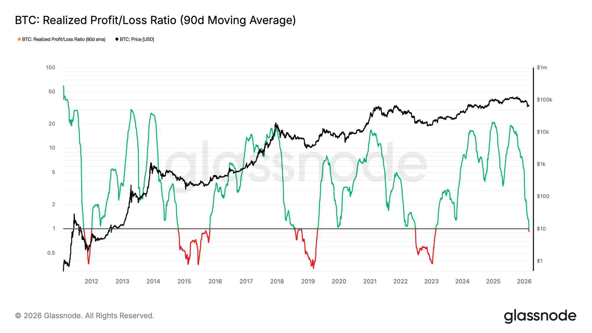 Historically, sustained breaks below 1.0 have persisted for six months or longer, reflecting prolonged periods of weak buy-side liquidity and constrained capital rotation. Only after a decisive reclaim of this level has the market typically entered a more constructive phase, characterized by renewed profitability and improving demand conditions.