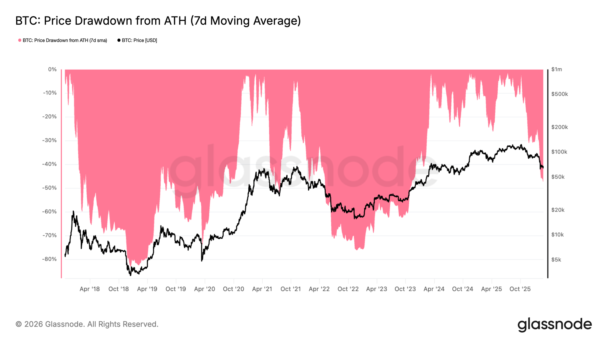 From a broader cyclical perspective, the 7-day moving average drawdown from the ATH currently sits at 47.3%, comparable to the early May 2022 range-bound phase that preceded further downside expansion. Historical analogues suggest that, at similar drawdown depths, time typically acts as a headwind rather than a tailwind for bullish continuation. Prolonged compression at these levels increases the probability that leveraged or structurally weak entities face mounting balance sheet stress.