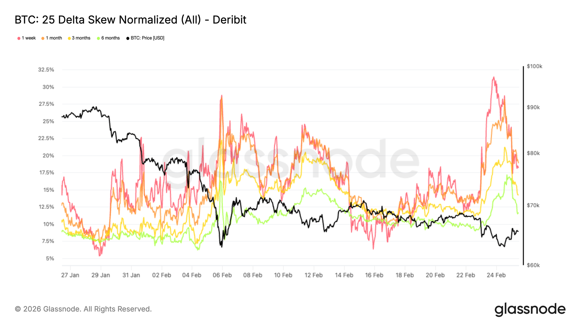 Skew has once again reached extreme asymmetry, approaching levels last seen on February 5 during the sharp drop toward 60K. At that time, the speed and amplitude of the move caught traders off guard, triggering late stage hedging and pushing puts to trade at a 28 percent premium over calls.