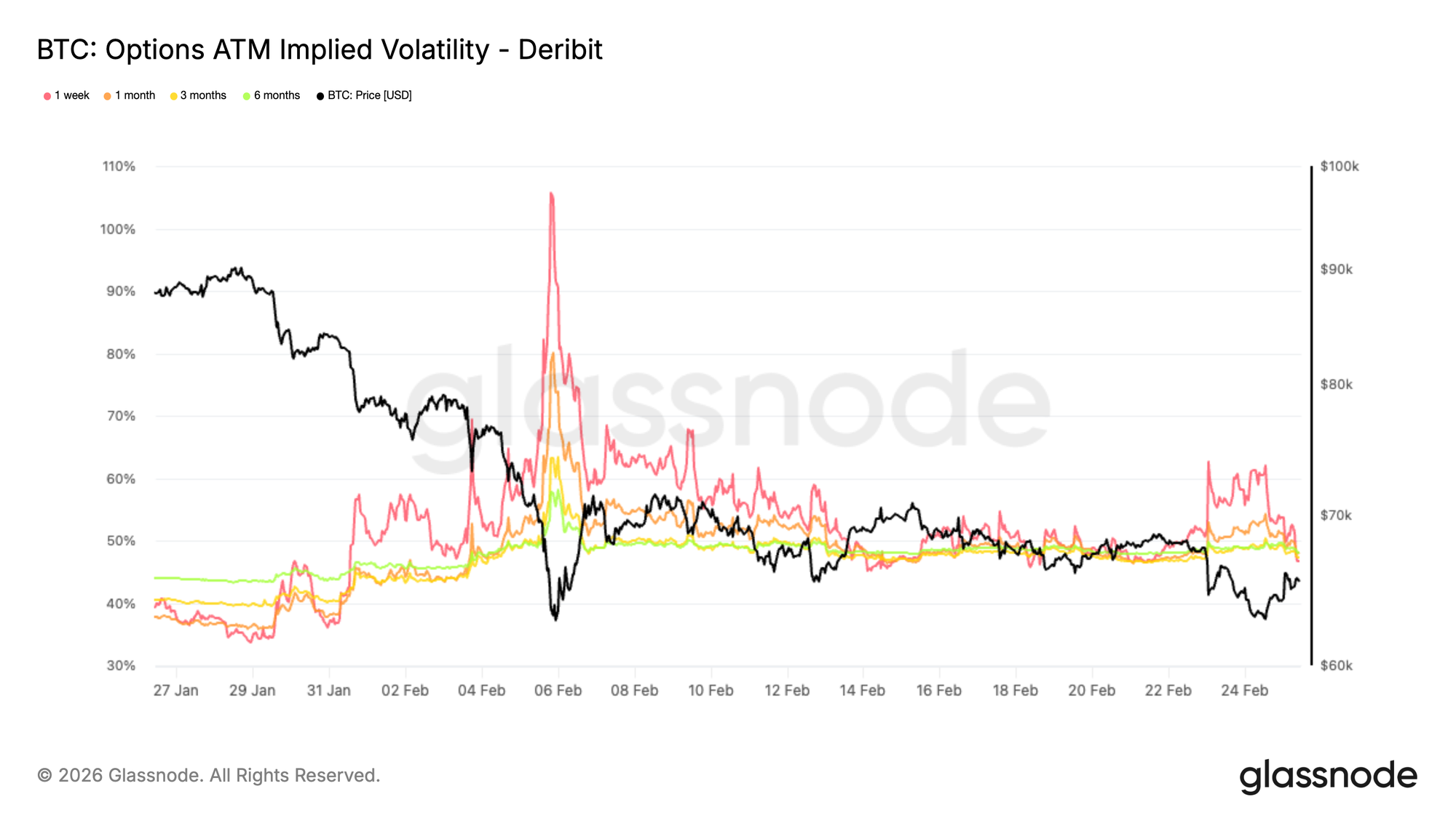 That repricing proved short lived. As price reclaimed 65K, one week volatility compressed back to 47 percent.