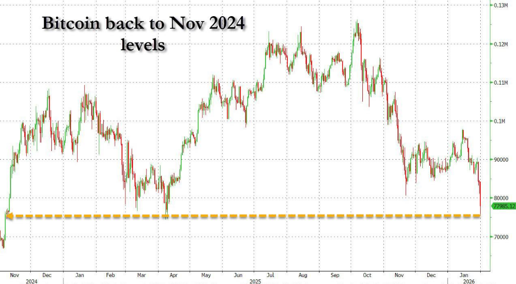 After closing at $83,817 on Friday, Bitcoin fell to $78,092 by Saturday evening, a drop of 7%. This decline brings it back to levels seen after April '25, continuing weeks of macro-level disappointment.