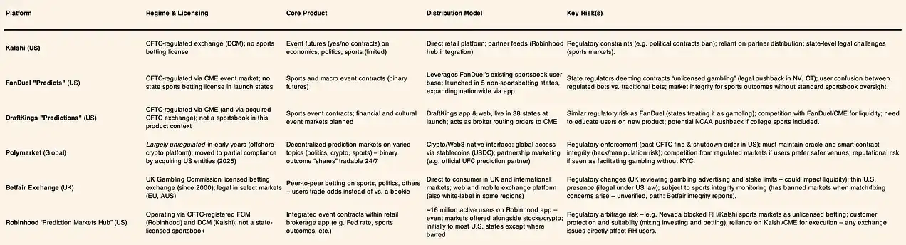 In response, established giants like FanDuel and DraftKings restrict prediction products to jurisdictions "without legal sports betting," highlighting that distribution strategy is now led by regulatory boundaries rather than user demand. The core implication is clear: scale is determined not by product innovation, but by regulatory tolerance. Contract design, settlement terms, marketing wording, and geographical rollout paths are being systematically engineered to pass legal qualification reviews; platforms that can operate within accepted regulatory frameworks will gain more lasting advantages. In this market, regulatory clarity itself forms a moat, while uncertainty directly limits growth.