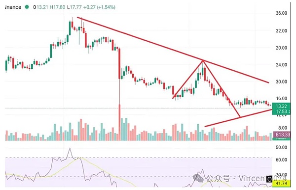 Currently at $13.20, it’s down 2.4% over the past week and 15% monthly, still stuck in a long-term downtrend – every rally since it last peaked above $30 has been pushed back by the descending resistance line. The price is now consolidating around $13, forming what looks like a descending triangle. Sellers are applying pressure from above, while buyers are desperately defending the $13 support. A break below could send it tumbling to $11.50, or even $10.