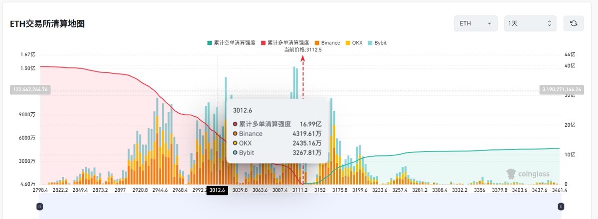 ETH这两天疯狂释放利好,各种公司各种国家各种大佬都在买入,但是风险还是存在的,合约老哥一定注意安全!ETH现价3112美元,如果跌100美元到3012美元,将有17亿美元的多头被清算! #ETH