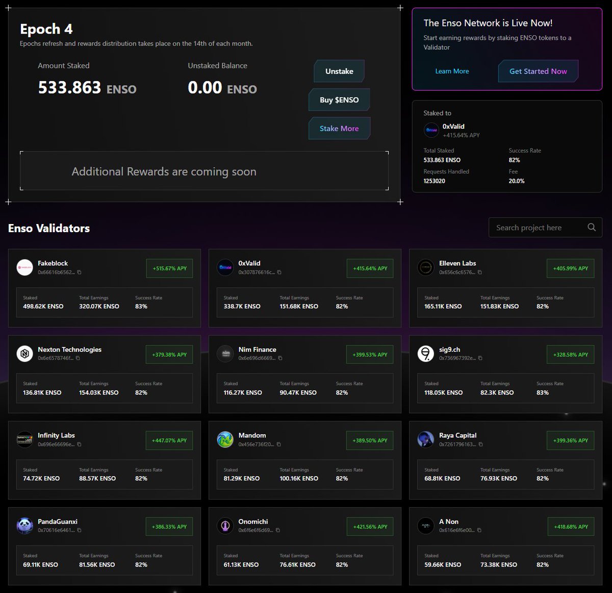 Enso staking currently offers up to ~515% APY across 12 active validators.