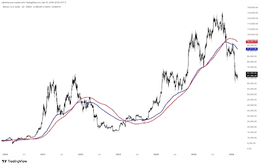 一位长期看好比特币的投资者呼吁投资者在市场面临严峻的短期挑战时保持谨慎和策略性。 市场分析师 Caleb Franzen 在 X 论坛上发表了一篇详细的博文,明确指出长期看好比特币并不意味着忽视当前价格结构的现实。他概述了一个基于熊市行为、移动平均线跌破和预设失效水平的分析框架。 识别关键移动平均线下的跌破 Franzen 指出,比特币在 2025 年 11 月跌破 2 日 200 日移动平均线云图(约 97,000 美元)是一个重要的转折点。他认为,每一次主要的比特币熊市都是从价格果断跌破这一水平开始的。 他博文附带的图表展示了比特币多年来的价格走势以及长期移动平均线云图。红色和蓝色条带分别表示价格在上升趋势中往往高于这些移动平均线,而在长期下降趋势中往往低于这些移动平均线。 以往每一轮熊市都始于跌破2日200日均线结构,随后出现持续疲软。 来源:Caleb Franzen 在 X 平台上发布的图表 Franzen 还特别指出了200周均线云图,历史上该水平线也曾是熊市的“磁铁”。在跌破该云图时,价格位于约55,000美元至65,000美元之间。然而,他指出,2022年比特币价格在触底反弹前曾跌破200周均线云图约30%。 考虑到这一点,比特币价格显然有可能跌破200周均线云图20%至33%,下行目标位在约37,000美元至44,000美元之间。 有趣的是,这个区间与长期持有者的实际价格(目前接近 41,700 美元)非常吻合,而 41,700 美元也是一个在熊市中经常吸引价格下跌的价位。 运用历史数据而不被其束缚 即使在强劲的牛市中,比特币也经历过多次 20% 到 30% 的回调。在熊市中,这些下跌可能会持续数个季度,而不仅仅是几周或几个月。然而,他强调,为长期下跌做好准备并不意味着假设它一定会发生。 尽管弗兰岑提出了一个基于历史指标的看跌基本观点,但他谨慎地指出,历史并不能保证未来会重演。他的方法是基于对概率的权衡,而不是对确定性的判断。 与其期待快速反弹而最终被更深的疲软所打个措手不及,不如做好应对持续数个季度下跌的准备,并在市场展现出韧性时感到惊喜。这种心态可以帮助投资者避免情绪化的决策。 此外,还有一种情况是,人们会将自己局限在单一的结果中。 如果比特币更早找到支撑并恢复上涨趋势,那么仅仅等待 40,000 美元的回测可能会付出惨痛的代价。有趣的是,弗兰岑也列出了会改变他立场的具体条件。 如果跌破 2 日 200 日均线云层是 2025 年 11 月的官方看跌信号,那么突破该结构上方则将成为看涨信号。重新站上 99,000 美元附近的 2 日 200 日均线云层和 55 周均线云层,是转为建设性走势的关键。 比特币日线图显示价格为 66,905 美元 | 数据来源:Tradingview.com 上的 BTCUSDT 交易对