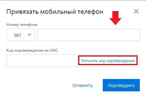 Затем, в появившемся окне введите номер телефона, который хотите привязать к вашему аккаунту и подтвердите действие с помощью кода, который придёт вам по SMS.