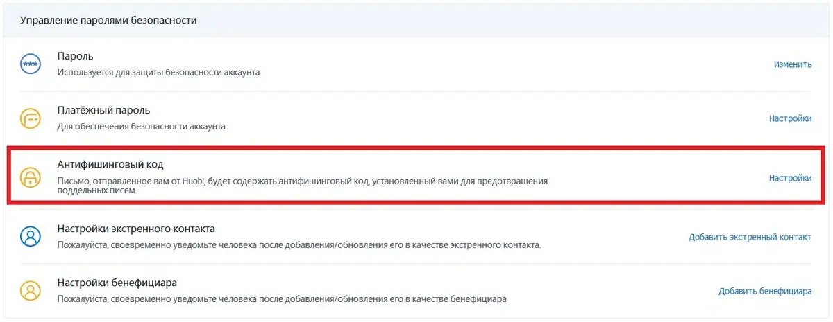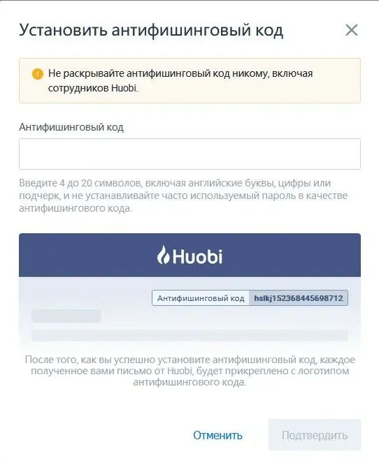 Антифишинговый код – это специальный код, который используется для проверки подлинности писем от Huobi. С его помощью можно удостовериться, что письмо пришло именно от Huobi, а не от мошенников.