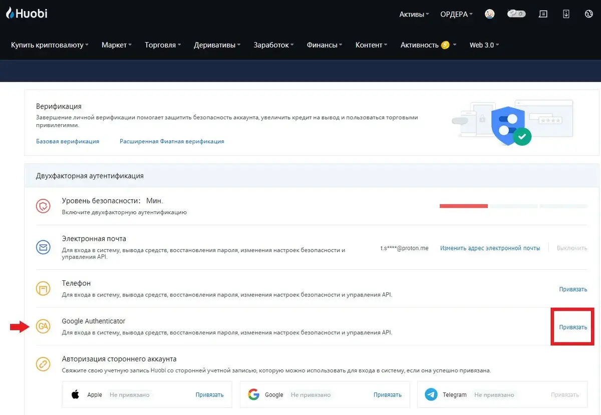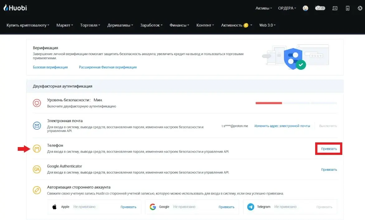 Для более полной настройки безопасности аккаунта советуем использовать веб-версию Huobi.