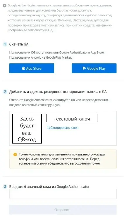После этого необходимо запустить на телефоне установленный Google Authenticator и отсканировать QR-код на странице безопасности Huobi. Затем введите 6-значный код, сгенерированный приложением в соответствующее поле, и нажмите «Отправить».