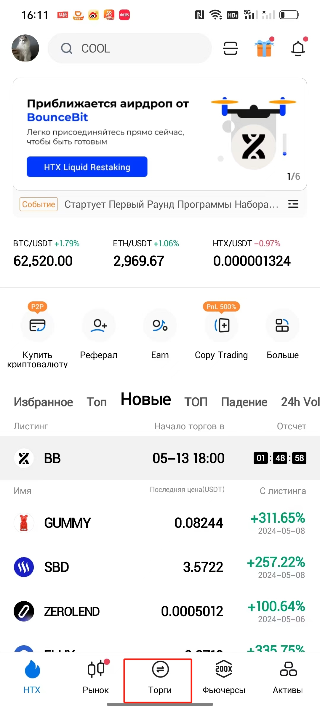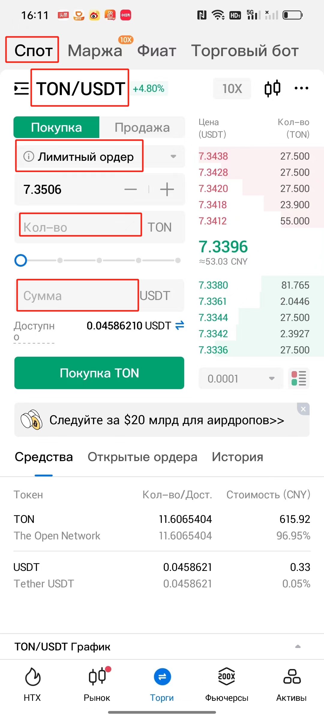 Войдите в свой аккаунт в приложении HTX, нажмите Торги в нижней части главной страницы и выберите Спот, чтобы подготовиться к Спотовой торговле. Выберите желаемую торговую пару, нажмите Покупка/Продажа, выберите тип ордера (например, Лимитный, Рыночный, TP/SL или Триггер), введите количество и цену или сдвиньте ползунок. Затем вы можете подтвердить ордер, нажав Покупка/Продажа.
